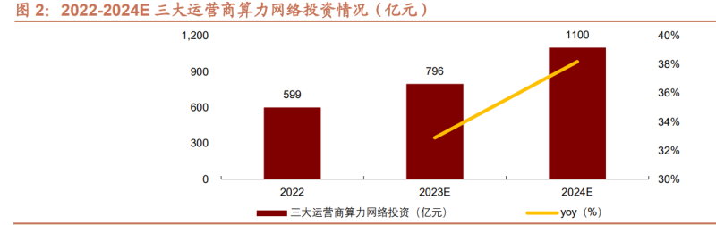 2023 年三大运营商算力网络总投资额达 796 亿元,同比增长 33%,预计 2024 年将增长至 1,100 亿元,同比增长 38%。2023 年三大运营商持续发力算力网络 建设,算力网络总投资达 796 亿元,同比增长 33%,其中中国移动/中国电信/ 中国联通算力网络投资额分别为 452 亿元/195 亿元/149 亿元,同比增长 34.9%/39.3%/19.4%。根据《通信产业报》预测,2024 年三大运营商算网资本 开支预计将达到 1,100 亿元,同比增长 38%。